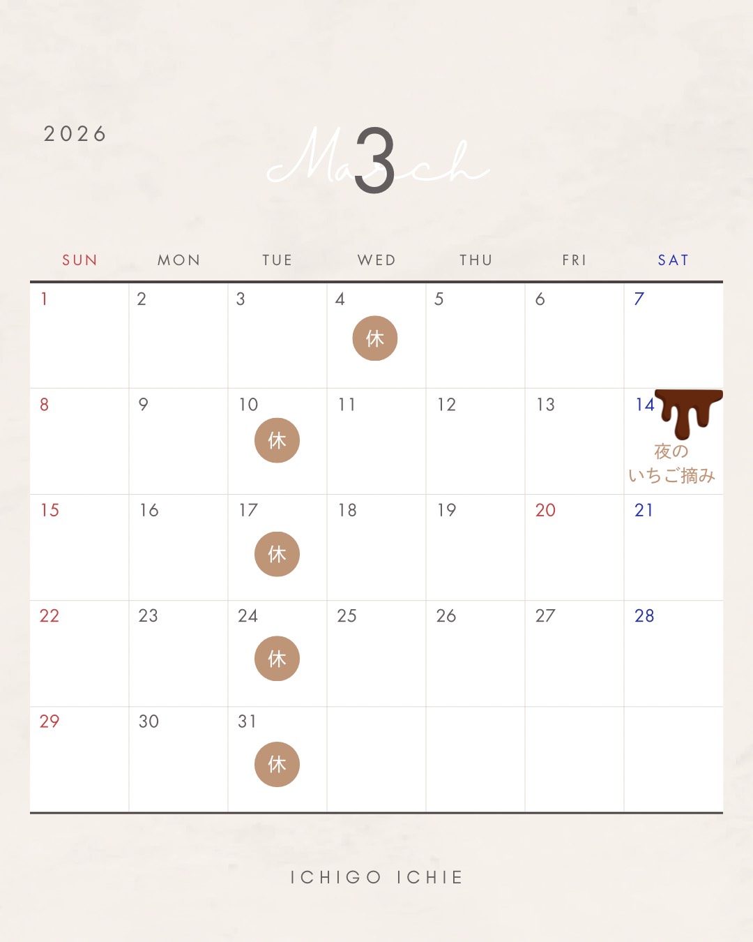 ※休の日は販売、いちご摘みどちらもお休みとなります。